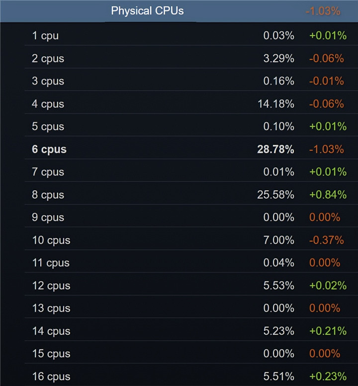 另外,4核心依然有14.18%排第三,但多核心趋势非常明显了,比如16核心这个月增加了0.23个百分点是最多的,已经有5.51%。