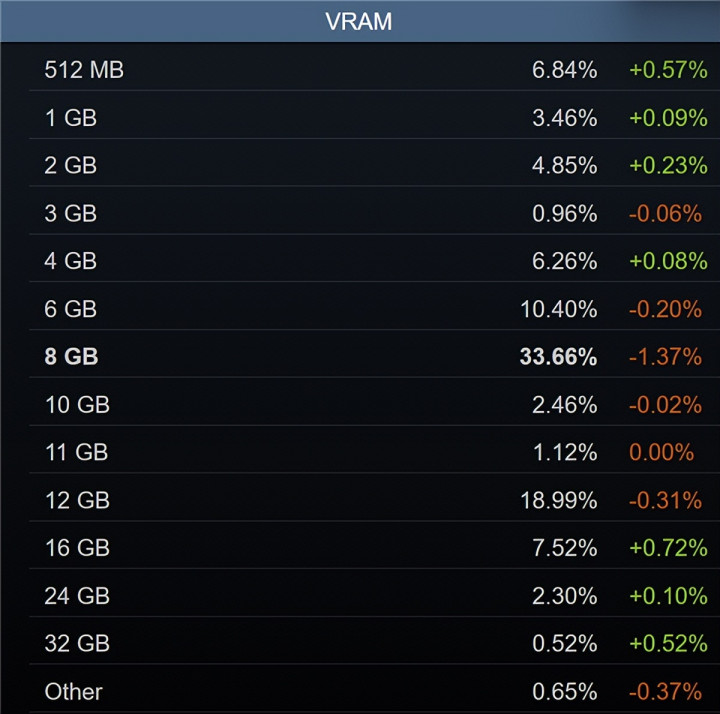 显存方面,8GB仍然是最流行的占据33.66%,毕竟历史基数太大,但这个月又损失了多达1.37个百分点,16GB则又增加了0.72个百分点,史上最大增幅,升至7.52%。
