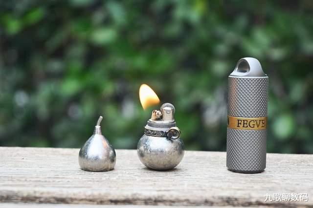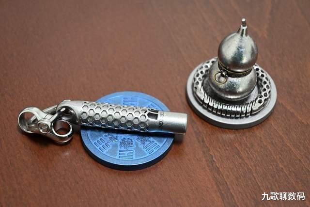先来看下新款的钛镶铜迷你葫芦打火机吧,印象中费戈出过好几款钛合金打火机,或斜纹、或枪匣的硬朗外观让人印象深刻。钛镶铜的迷你款也有,圆柱状的胶囊造型可以挂在钥匙扣上随身使用。不过今天要分享的这款采用了宝葫芦的样式,更新颖别致,超袖珍的体型兼具实用与把玩。