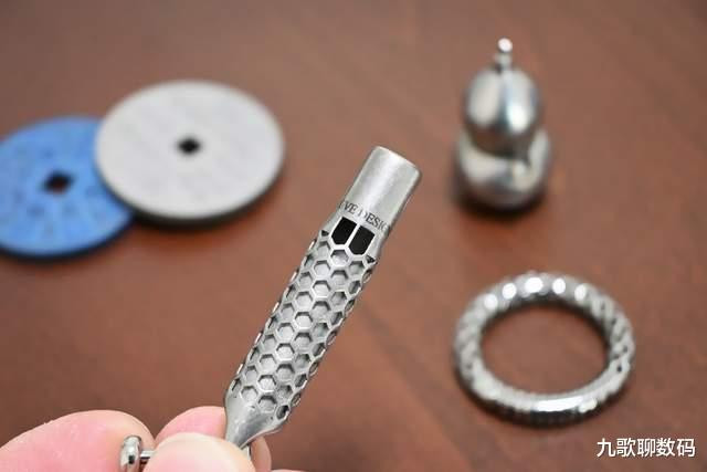 再来看下它的细节,镂空状为仿生六边形的蜂巢设计(之所以采用蜂窝网络,不仅是因其美观大方,而且防滑,握感上也更为舒适),颜值上还是很高的。而且细节处也与传统锻造或CNC加工工艺不同,它的结构自由度更高,不会受限于减材制造的特性,轻松实现从内到外皆通透的复杂镂空造型,精致感拉满。